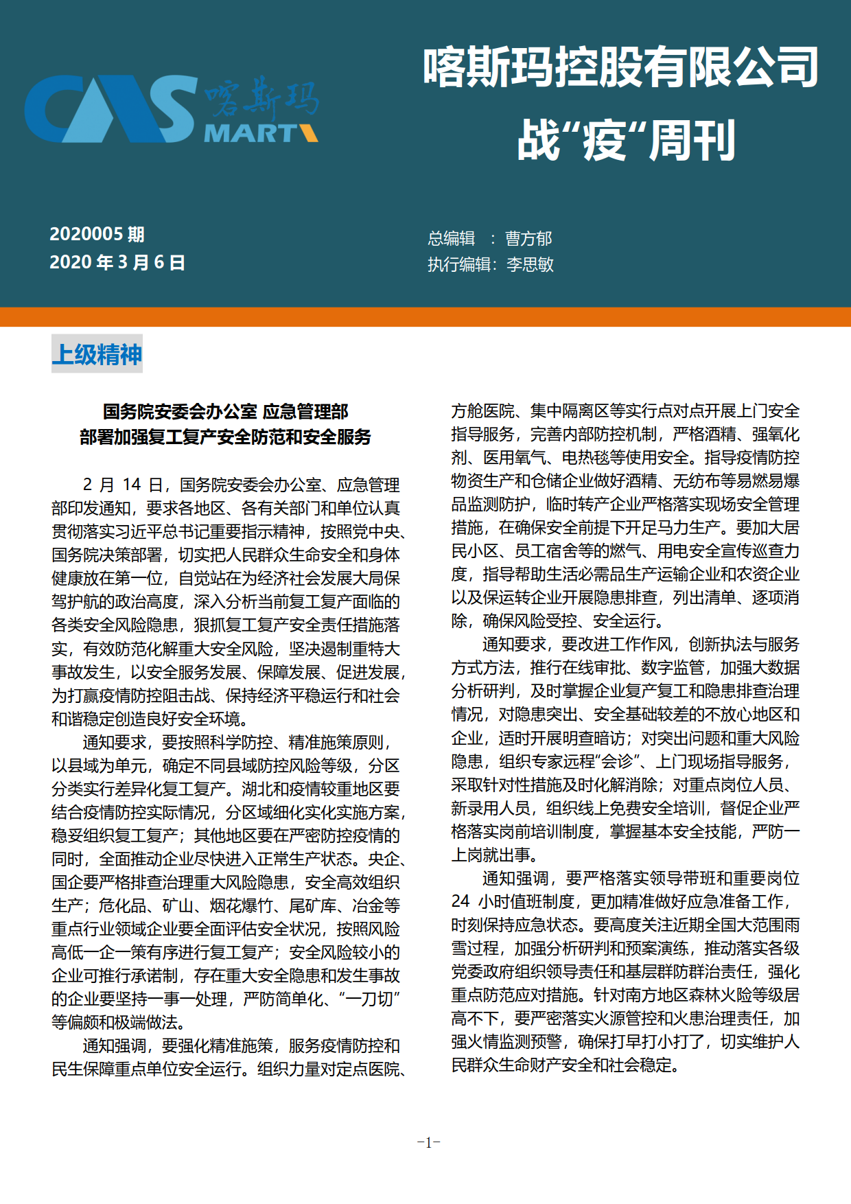 喀斯瑪控股有限公司戰(zhàn)“疫”周刊2020005期